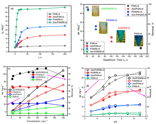 In this study, it was seen that adsorption was supported at high concentrations (Figure 2c) and pHs (Figure 2d). As the concentration and pH increased, the amount adsorbed at equilibrium increased but the removal percentage decreased after reaching equilibrium at 200 ppm and pH 9. This may be due to the adsorption of active sites with MB molecules [32]. However, equilibrium tended to be reached at pH 7–9 for the qe and removal percent. In addition, MB adsorption at low pHs decreased because the adsorbent was protonated with H+ ions and thus gained a + charge, and because the cationic structures of MB electrostatically repelled each other. In contrast, at high pHs, since the presence of OH− ions in the environment and the adsorbent surface coordinated with OH− groups, MB molecules were electrostatically attracted by the adsorbent surface groups and the adsorption increased, which was an expected result [25,26,33,34]. Higher yields were obtained from PAN-nl via treatment with Ni+2 and TEA at different pHs. While qe was calculated as 1.85 mg g−1 for PAN-nl at pH 9, it was calculated as 45.96 mg g−1 for Am/PAN/Ni-nl.