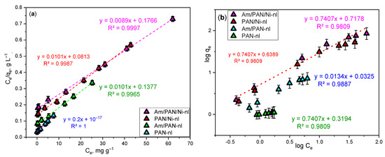 (a) Langmuir and (b) Freundlich adsorption isotherms (for all those electrospun) (30 °C, 0.1 g of adsorbent, 50 mL of solution, pH 9).
