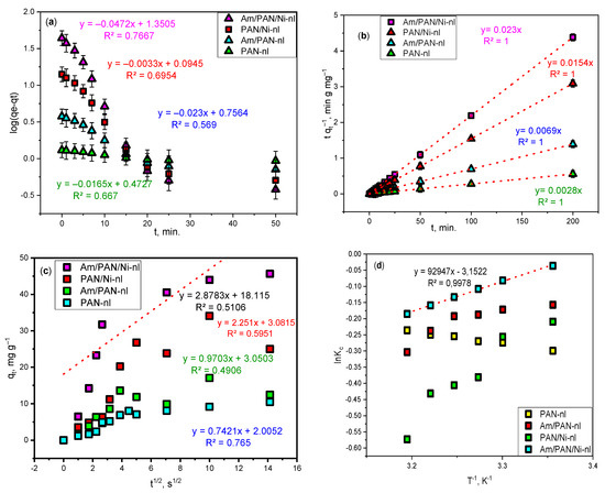 (a) Pseudo-first-order kinetics model graph, (b) Ppseudo-second-order kinetics model graph, (c) Intraparticle diffusion kinetics model graph, and (d) Van’t Hoff graph for all nanofiber.