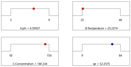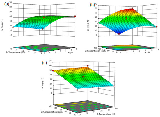 Since R2 is a numerical value indicating the degree of fit, the best fit is obtained at the R2 value closest to 1. Therefore, it can be said that the best fit in this study based on the data in Table 6 is in the quadratic model with a R2 value of 0.9148–0.9878. An equation that can give the effect of concentration, temperature and pH on the qe value was obtained using this model. Since the equation (Equation (11)) contains mathematical functions that give the relationship between these factors affecting adsorption, it allows researchers to predict how the adsorption capacity qe value will be affected when conditions change.