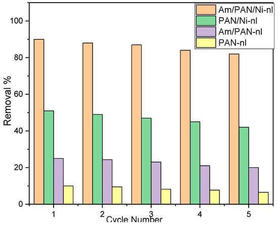 Desorption tests were performed to understand the degree of interaction between Am/PAN/Ni-nl and MB and the properties of the adsorbent. Desorption was also performed in acidic media (0.5 mol L−1 HCl) for the regeneration of the adsorbent [43]. This effect showed that the adsorbent surface interacted with the cationic species in the medium. As reported in the literature, MB helped to make the adsorbent surface usable again for uptake. The results were compared with all the adsorbents (Figure 8).