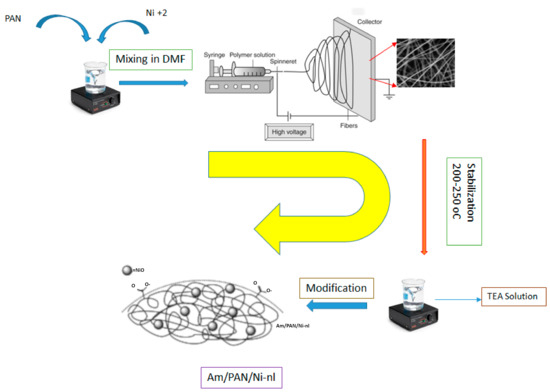 The flowchart of the modification of Am/PAN/Ni-nl and electrospun.