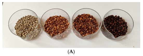 The coffee samples used in this analysis were from Ethiopia, species Coffea arabica L. cultivated in two regions: Jimma (N 7°60′72.2″, E 36°71′18.09″) and Sidama (N 6°85′19.1″, E 38°44′69.2″). Hence, the varieties Sidama and Jimma are discussed later in the manuscript. The coffee roasting method involved the use of a 1400 W coffee roaster at a constant temperature of 230 °C for three stages of 5, 7, and 9 min, respectively (Figure 1A,B). Each variety was roasted in 3 different time variants, giving a total of 6 trials (in the further stage of chemical analyses, each analysis was performed in 3 replicates). After the roasting process, the beans were cooled to ambient temperature to preserve their properties before grinding for brewing. This controlled approach ensured a well-developed flavor profile through precise management of temperature and time during roasting. The ground coffee was then stored in airtight containers to maintain freshness and prevent moisture absorption.