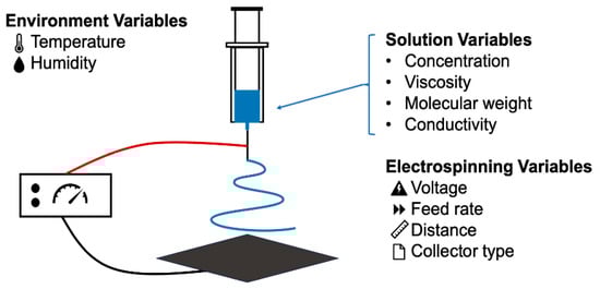 Electrospinning setup and variables. Adapted from Forgie et al. [].