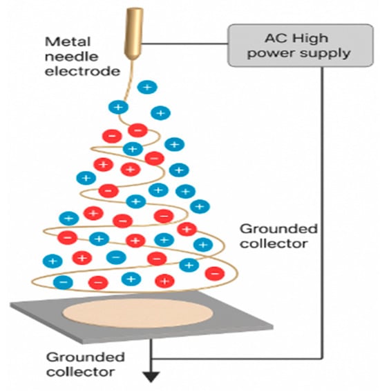 AC electrospinning introduces a periodically reversing electric field, which causes the polarity of the applied voltage to oscillate, typically in the range of tens to thousands of hertz. The frequent reversal of charge polarity prevents the excessive accumulation of net charge on the polymer jet. Figure 4 shows the charges in AC electrospinning process. This suppresses whipping instabilities and promotes a stable Taylor cone, facilitating smoother and more consistent fiber production []. The oscillating field enables the bidirectional migration of charge carriers, allowing a more uniform internal distribution of charges within the polymer solution []. This helps produce defect-free fibers with homogeneous morphology []. Since the net charge on the jet is periodically neutralized, non-conductive or grounded collectors are not strictly necessary. Fibers can deposit on insulating substrates or even in free space, creating a cloud-like nanofiber plume [].