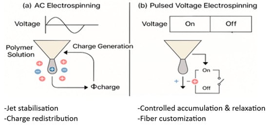 Advancements in electrospinning methods have emerged to overcome the limitations of conventional direct current (DC) systems. Two up-and-coming techniques are alternating current (AC) electrospinning and pulsed voltage electrospinning, which introduce dynamic electric field modulation to enhance process stability, fiber uniformity, and production scalability. These methods not only address charge accumulation and whipping instabilities but also open new possibilities for nanofiber application in biomedical, industrial, and environmental fields [,,].