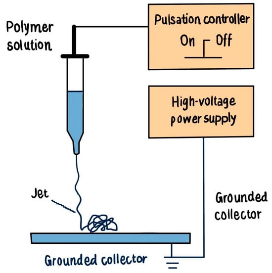 Pulsed voltage electrospinning applies intermittent high-voltage pulses to the polymer solution, offering precise control over jet initiation and stop. Unlike continuous fields, this modulation allows the jet to relax between pulses, reducing mechanical instabilities and promoting consistent fiber formation []. Pulse parameters such as frequency, pulse width, and duty cycle directly affect the jet’s behavior, morphology, and fiber diameter. Han and Steckl noted that pulsed systems offer enhanced control over charge delivery, contributing to fiber smoothness and defect suppression, particularly under challenging environmental or material conditions []. Li et al. demonstrated that decreasing the duty cycle leads to thinner fibers and reduced diameter variability. In their study, pulsed systems generated fibers with diameters up to 30% smaller compared to DC analogs under the same voltage and flow conditions []. This precision makes PV systems ideal for applications like drug delivery, where fiber dimensions influence release kinetics, and wound healing, where structural consistency impacts tissue integration. Another benefit of PV electrospinning is the ability to create chopped or segmented fibers. Hu X et al. used tailored pulse durations to fabricate nanofibers of controlled lengths, which are particularly suited for injectable scaffolds or composite reinforcements []. A simple setup of Pulsed Voltage electrospinning is shown in Figure 7.