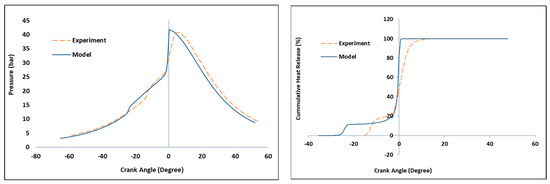 Comparison of the simulated model against the experimental data: (left) in-cylinder pressure; (right) cumulative heat release. AFR = 50, CR = 10, intake pressure = 95 kPa, intake temperature =333 K.