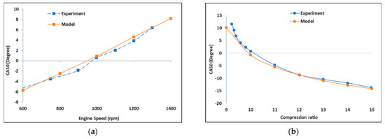 Comparison of the simulated model against the experimental one: (a) CA50 against engine speed; (b) CA50 against compression ratio. AFR = 50, intake pressure = 95 kPa, intake temperature = 333 K.