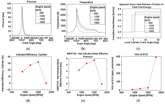 Effect of varying engine speed on in-cylinder (a) pressure, (b) temperature, (c) cumulative heat release, (d) indicated efficiency, (e) IMEP720, and (f) NOx at EVO: λ = 1, BR = NH3 (90%), P = 1 bar, T = 333 K, CR = 20.