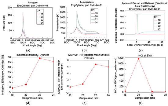 Effect of varying compression ratio on cylinder (a) pressure, (b) temperature, (c) cumulative heat release, (d) indicated efficiency, (e) IMEP720, and (f) NOx at EVO: ER = 1, BR = NH3 (90%), P = 1 bar, T = 333 K, engine speed = 1500 rpm.