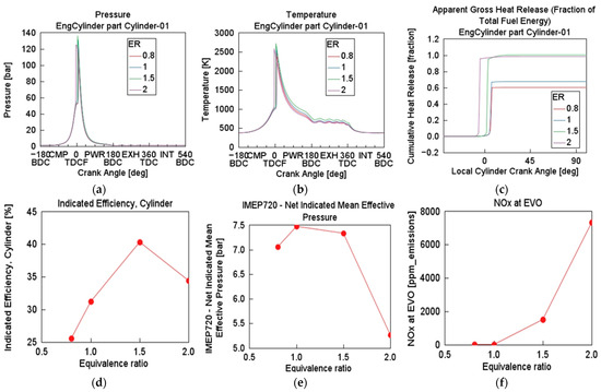 Effect of varying equivalence ratio on cylinder (a) pressure, (b) temperature, (c) cumulative heat release, (d) indicated efficiency, (e) IMEP720, and (f) NOx at EVO: CR = 20, BR = NH3 (90%), P = 1 bar, T = 333 K, engine speed = 1500 rpm.