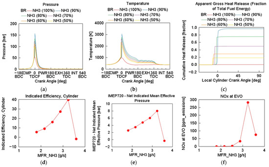 Effect of varying NH3–H2 blend ratio on cylinder (a) pressure, (b) temperature, (c) cumulative heat release, (d) indicated efficiency, (e) IMEP720, and (f) NOx at EVO: CR = 20, ER = 1.5, P = 1 bar, T = 333 K, engine speed = 1500 rpm.