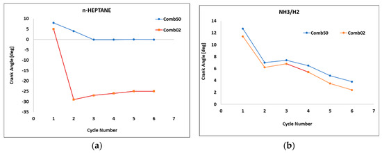 For ensuring the stability and reliability of the results, a cycle-to-cycle variability analysis was performed on the studied engine model at λ (1.4). The CA02 or Comb02 (crank angle at 2% total heat release) and CA50 were investigated against the cycle numbers, as illustrated in Figure 7. This was significant for understanding the combustion stability and assessing how efficiently the fuel combustion proceeded. In Figure 7a, the n-heptane plot shows significant CCV, especially in the early combustion phase (Comb02). The crank angle for Comb02 drops sharply from +5 to −29 CA°, with a large standard deviation of 12.91° and a range of 34°, indicating highly unstable ignition behavior. Combustion phasing CA50 (Comb50) is more stable, gradually declining from 8° to 0° with lower variability (standard deviation of 3.35°). This suggests that the baseline combustion suffers from irregular ignition timing in the initial combustion stage. However, CA50 was the more important parameter to be analyzed for optimal performance, efficiency and emissions. CA50 is observed to stabilize after the third cycle until convergence. In contrast, the NH3/H2 plots demonstrate more consistent combustion behavior. Both Comb02 and Comb50 showed smooth, gradually decreasing crank angles across cycles, with relatively low standard deviations (about 3.15°, slightly above the typical value) and narrow ranges (about 9°). This indicates good repeatability and controlled combustion phasing for both early and mid-stage combustion. However, six cycles are not statistically robust to draw strong conclusions on CCV, especially in HCCI combustion, where stochastic variations are significant. However, this study employed a six-cycle simulation horizon due to constraints in computational time and model convergence behavior, especially when using detailed chemical mechanisms. Previous work using 0D HCCI models with complex fuel chemistry has shown that combustion stability can still be inferred from early-cycle behavior, provided the model reaches convergence and no significant transience is observed beyond 3–4 cycles [9,15]. Post-transient convergence was also confirmed for all cases before data logging.
