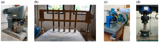 Equipment used in the manufacture of cylindrical samples and concrete blocks: (a) mortar mixer; (b) vibrating table; (c) manual rectifier; (d) Emic DL 30000 N model press.