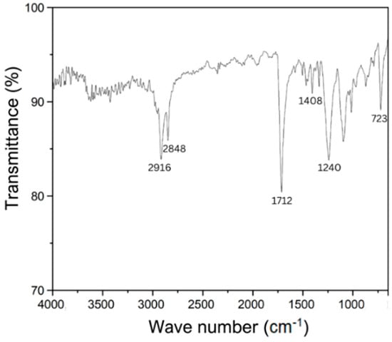 In the FTIR analysis (Figure 2), the bands in the range 2916 to 2848 cm−1 are attributed to symmetric stretches of the bonds (CH2); the band at 1712 cm−1 is related to bond stretching (C=O) of the ester; the bands at 1450 to 1375 cm−1 are associated with angular deformation of the group (CH3) the bands at 1275 to 1200 cm−1 are characteristic of bond stretching (C=O)-C. The band at 723 cm−1 is typical of the deformation of the aromatic ring (C=C) outside the frame. Based on this analysis and in literature reports [27,28], it was possible to confirm that the powdered residue is made up of PET/PE.