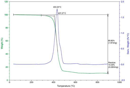 The thermogravimetric curve obtained by the pyrolysis of powdered PET/PE (Figure 3) shows Posteriorly initial temperature and maximum degradation temperature with mass loss of 407.27 °C and 433.20 °C, respectively. Stabilization of the residual mass was observed from 620 °C; the mass loss was 89.9% of the initial mass, PET/PE presented a residual mass of 10.1%, which, according to Singh et al. [29], is a value normally found in the thermal degradation of PET in an inert atmosphere, while LDPE has practically no significant residual mass at the end of pyrolysis process.