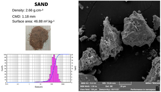 In order to compare the morphology of fine aggregates, scanning electron microscopy (SEM) on the natural quartz sand as well, employing a field emission scanning electron microscope (FE) model Mira 3, Tescan, with a power of 15 kV. Both aggregates underwent laser granulometry analysis on a BETTERSIZE/S3 PLUS laser particle analyzer granulometer, with analysis ranging from 0.01 to 3500 µm—Laser Diffraction: DLOIOS, liquid dispersion system, employing ISO 13320 [21] as the essay parameter for verification and comparison of the sizes of both PET/PE particles and natural sand. Additionally, the coarse aggregates were characterized only by their density and granulometric curve.