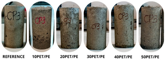 Since the 10(PET/PE) content presented the best result in resistance to compression, this composition was chosen for the repetition of analysis, with a curing period of 28 days (Figure 10), and verified the potential of application as sealing concrete blocks, without any structural function. It was possible to verify the visual similarity of the reference concrete cylindrical samples to those with 10(PET/PE); however, the greater the water/cement relation, the greater the porosity of the concrete [37].