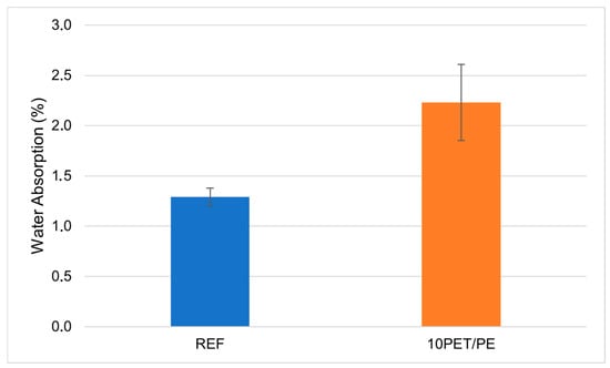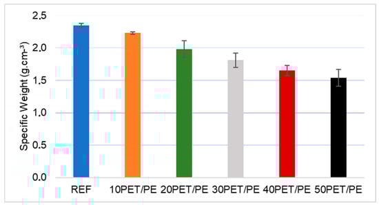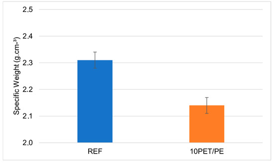 In the water absorption tests, it was verified that the concrete cylindrical samples with 10(PET/PE) content presented absorption an ratio (Figure 11) of 2.2 ± 0.2%, while the reference sample presented 1.3 ± 0.1%. In the axial compressive strength test with a curing period of 28 days, (Figure 12), it was verified that the 10% PET/PE (23.2 ± 2.2 MPa) formulation presented a result that is statistically similar to the reference sample 25.9 ± 1.9 MPa. In this period the constituents of Portland cement, 90% is composed of tricalcium silicate (C3S), dicalcium silicate (C2S), tricalcium aluminate (C3A) and tetra-calcium aluminon ferrite (C4AF), which chemically reacts with water [38], and the formation of these crystals is what might confer resistance to concrete, which in the case of the 10(PET/PE) formulation was not significantly affected. When the specific weight (Figure 13), of reference is compared to the 10(PET/PE) content, it is observed that this parameter decreases as the amount of polymers increases.