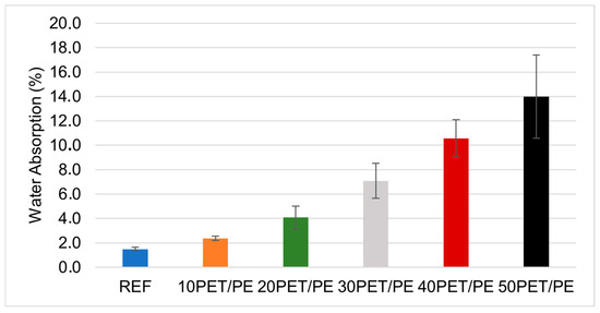 Figure 7 shows the water absorption with a curing period of 7 days. In relation to water absorption analyses, it was observed that with increased amounts of PET/PE in concrete, there was an increase in this parameter in the samples, for a 10(PET/PE) content; absorption was (2.4 ± 0.2)%, while for the reference, it was (1.5 ± 0.1)%, which, according to the Analysis of Variance (ANOVA), is statistically equal to a confidence level of 95%. The 20, 30, 40 and 50(PET/PE) contents presented increased water absorption contents, which might attributed to the weak bond between the polymer residues and the cement paste, which allows water absorption by capillarity, through the existing gaps between the PET/PE residues and cement paste, as well as the interaction between water and residues, keeping it absorbed on the surface of the particle. The addition of plastic residues affects the effect of distribution of the water available in the paste and, consequently, the workability of the concrete [36].