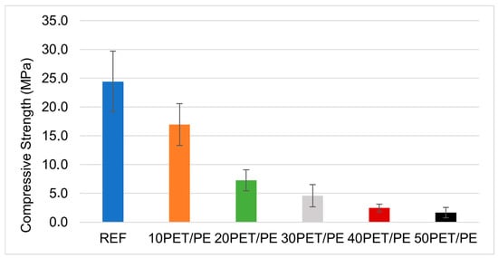 Figure 8 shows the compressive strength of concrete samples with a curing period of 7 days. In relation to axial compressive strength, it was verified that an increase in PET/PE quality resulted in decreased resistance to compression of the concrete cylindrical bodies, which might be explained, in part, by the fact that natural sand is more mechanically resistant than polymers, due to its mineral composition, features of chemical bonds and crystalline structures. The formulation with powdered residues that presented the best performance was the one with a 10(PET/PE) content, which presented a 16.9 ± 3.6 MPa compression. In general, the use of PET partially replacing the fine aggregate in concrete resulted in a loss of strength, but it also provided an adequate discharge of this residue, which would otherwise be discharged in sanitary landfills or be incorrectly disposed [4]. Thus, less chemical interaction was observed between the polymer and the cement matrix when compared to light aggregates, generating residual porosity, a fact that causes an increase in water absorption and decreased resistance to compression of the concrete [34].