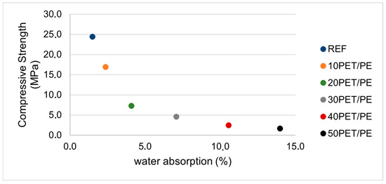 Figure 9 shows the relationship between mechanical and physical properties, compressive strength versus water absorption, of concrete samples with a curing period of 7 days. It was observed that increased PET/PE favors absorption of water and decreases compressive strength. According to Rahmani et al. [14], with an increase of PET content to 10 and 15%, resistance to compression by the concrete decreased, because the PET particles acted as barriers and prevented the cement paste remained adhered to the aggregates, gradually decreasing the concrete’s resistance.