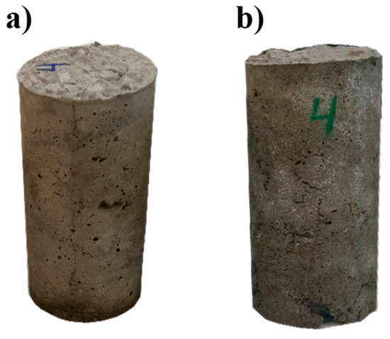 Cylindrical specimens with a curing period of 28 days: reference sample (a), and 10(PET/PE) (b).