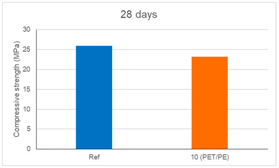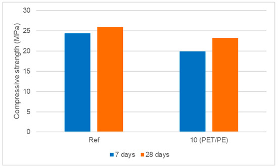 When comparing the results of compression tests of concrete cylindrical samples with curing periods of 7 and 28 days, it was verified that there was an increase in resistance to compression (Figure 14). The reference formulation presented an increase in resistance to compression of 6.2%, while 10(PET/PE) concrete content reached 37.3%; within this perspective, with the passing of time, crystallization of oxides comprising the concrete were successful. Although preliminary results suggested that powdered PET/PE did not affect cement hydration, further analyses should be carried out to substantiate this claim. Additionally, the homogeneity of the cement paste might have contributed to the reduction in the presence of pores. Therefore, it was possible to consider that the formulation with 10% sand replacement presented potential for being used as alternative raw material in civil construction, in accordance with the principles of a circular economy.