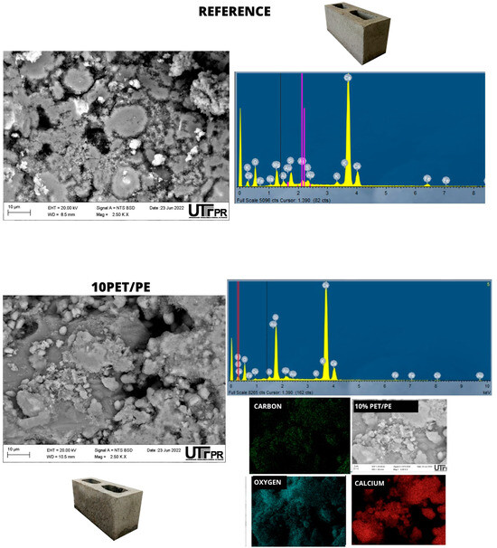The reference concrete blocks and those with a 10(PET/PE) content were compared according to the visual and morphological aspects from the SEM analysis with a 2500× increase. It can be considered that the sample with 10% powdered PET/PE content presented homogeneity in the cement paste (Figure 15), with little difference when compared with the reference and, when analyzing the chemical elements identified in the reference EDS mapping, the presence of chemical elements calcium, oxygen, silicon, aluminum and iron was observed, while the EDS for 10(PET/PE) differentiated itself by the presence of carbon, an element that is characteristic of the composition of this polymer, which was also verified in the FTIR analysis to which the residue was submitted, which found the presence of functional carbonyl groups (C=O), aromatic rings (C=C), esters (C=O) and aliphatic C-H2. Thus, such presence of carbon, calcium and oxygen in 10(PET/PE) concrete confirms the presence of elements comprising the crystalline structures of concrete, which corresponds to the four main cement compounds that react with water to form C3S, C2S, C3A and C4AF, which confer concrete proprieties [39] and the satisfactory distribution of polymer residue, showing its potential for being used as a substitute for fine aggregates. The manufactured concrete blocks were submitted to tests of resistance to compression and water absorption, and the results obtained (Table 3) were compared to the NBR 6136 [26] rule and classified as not presenting or presenting structural function.
