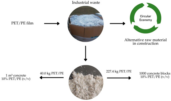 In the industrial sector, searching for alternatives for appreciation of by-products confers a company greater economic income, minimization of costs related to the destination of by-products and a commitment for the environment. Plastic waste (plastic bottles, bags and sheets) is not readily biodegradable, which makes it one of the most challenging sources of pollution. According to previous studies [1,2], plastic waste generation increased from 156 million tonnes in 2000 to 353 million tonnes in 2019. According to OECD projections (2024) [3], by 2040, recycled plastics will account for just 6% of total production. One possibility would be inserting the industrial residues of a certain sector into another, so that it closes cycles and opens revenue opportunities for the entire productive chain, by way of a circular economy. According to Preston [4], what has already been thought of as a circular economy (CE) model is one in which the industrial system is restoring or regenerative by design. Within this perspective, new business models are developed in order to decrease the need for virgin raw materials. This is done by rethinking how production chains can become closed cycles. A possible solution for the destination problem consists in the incorporation of polymer residues as aggregates in the preparation of concrete [5,6]. It is important to reuse and recycle these wastes as construction material for better conservation of natural resources and reduce embodied energy [7]. The circular economy presents an alternative to the linear “take, make, use, dispose” system. It attempts to keep resources in use for as long as possible, maximize their value while they are in use, and recover and regenerate products at the end of their useful lives [8].