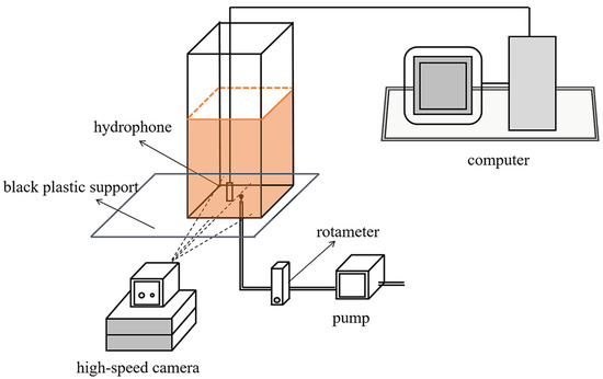 The experimental platform consists of a water tank support system, data acquisition system, flow monitoring system, and gas supply pipeline system. The schematic diagram of the bubble behavior and acoustic characteristics synchronous measurement system is shown in Figure 1.