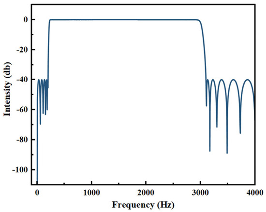 In the laboratory environment, environmental noise usually shows relatively stable characteristics, and its main frequency components are concentrated below 300 Hz and above 3000 Hz. Therefore, a band-pass filter with a passband frequency range of 300–3000 Hz is chosen. At present, band-pass filters are divided into Infinite Impulse Response (IIR) and Finite Impulse Response (FIR) filters [11]. Compared with FIR filters, IIR filters can usually achieve similar filtering performance with fewer coefficients and have higher computational efficiency in many cases. Therefore, the IIR band-pass filter is selected to reduce the noise of the sound waveform, and then the relevant information about the acoustic waveform is obtained [12]. The frequency response curve of the IIR band-pass filter is shown in Figure 2. It can be seen from the figure that the frequencies below 300 Hz and above 3000 Hz are processed, and that the attenuation reaches more than 40 db. The energy retention rate of the target signal in the passband is high, which provides a guarantee for the accuracy of the experiment.