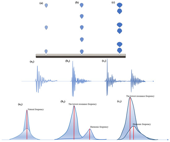 Then, with the further increase in gas flow velocity, the bubble flow pattern changed from single-chain bubble flow to dual-stage chain bubble flow. The bubbles begin to interact with each other in terms of shape, as shown in Figure 4c. Due to the influence of the wake flow of the previous bubble, the shape of the next bubble will change significantly, that is, the bottom angle of the previous bubble is much larger than that of the second bubble [17]. Correspondingly, the acoustic signal waveform characteristics of the bubbles appear alternately, and the adjacent acoustic signals show obvious differences. As shown in Figure 4(c1), it can be seen that since the bottom angle of the previous bubble is larger than the bottom angle of the second bubble, the highest peak value of the previous bubble is much larger than the peak value of the next bubble [18]. It can be seen from Figure 4(c2) and Table 3 that the lowest resonance frequency of this flow pattern is even lower than 760 Hz (energy ratio of 90%), and the harmonic frequency band gradually approaches the lowest resonance frequency.