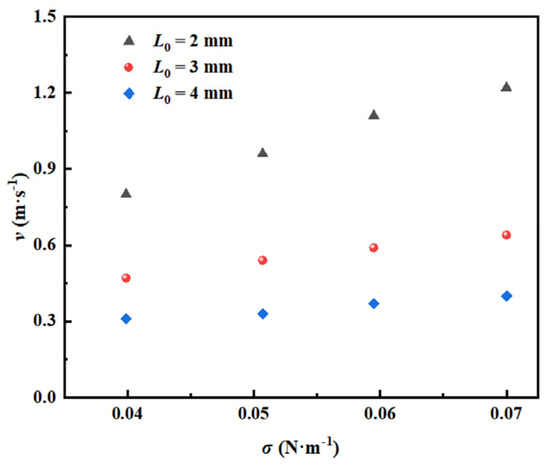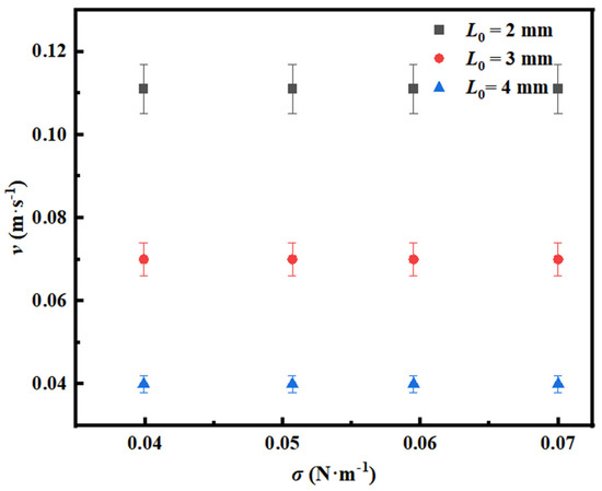 As shown in Figure 6, under the condition of a gas flow velocity of 0.111 m/s and orifice diameter of 2 mm, the increase in surface tension will lead to the increase in bubble radius and bubble spacing. The phenomenon can be explained as follows: As the surface tension increases, the rear interface of a growing bubble extends backward along the liquid phase, while the front interface continuously stretches, forming new gas–liquid interfaces. When the bubble surface near the orifice is subjected to squeezing, the liquid accumulates at the orifice edge, enhancing interfacial adhesion and significantly delaying the bubble detachment process [19]. This mechanism directly leads to the increase in bubble radius from 2.1756 mm to 2.2564 mm. The increase in surface tension will aggravate the shrinkage rate at the bottom of the bubble and accelerate the rising speed of the bubble, which leads to the increase in bubble spacing [18]. Because the influence of the two on the critical gas flow velocity offsets each other, the critical gas flow velocity finally remains stable when the surface tension changes.