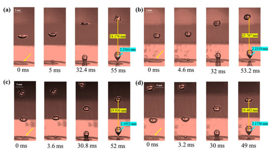 Under the conditions of gas flow velocity of 0.111 m/s and orifice diameter of 2 mm, the effect of dynamic viscosity on bubble formation: (a) 0.016 Pa·s; (b) 0.012 Pa·s; (c) 0.008 Pa·s; (d) 0.004 Pa·s.