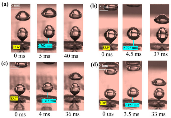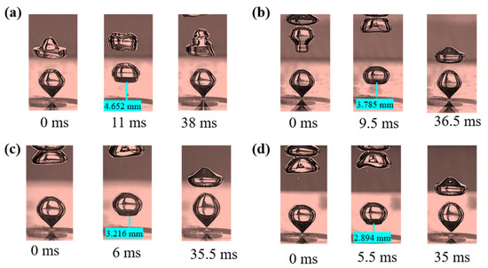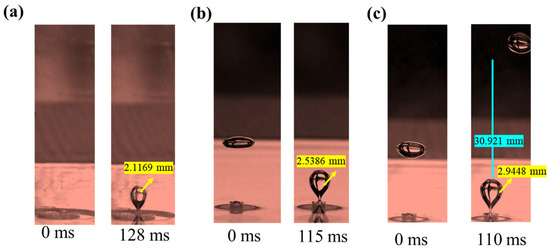 It can be seen from Figure 8 that the surface tension increases under the conditions of a constant orifice diameter and gas flow velocity, and that the time interval of the second bubble formation is prolonged. Meanwhile, the increase in surface tension accelerates the shrinkage rate of the bubble bottom. The synergistic effect of the two makes the distance between the lower surface of the first bubble and the upper surface of the second bubble increase from 2.894 mm to 4.652 mm with the increase in surface tension. When the distance exceeds the critical interaction distance, the disturbance effect of the first bubble on the second bubble formation process is significantly weakened. Therefore, in order to realize the transition from single-chain bubble flow to dual-stage chain bubble flow, the decoupling effect caused by the increase in surface tension must be compensated for by increasing the gas flow velocity.