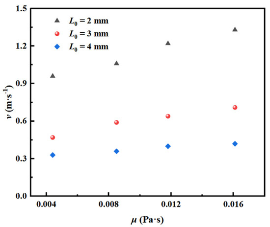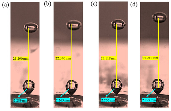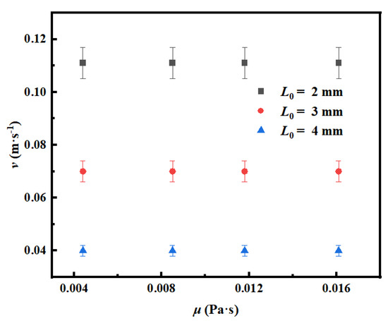 It can be seen from Figure 10 that the bubble radius remains constant (2.25 ± 0.05 mm) with the change in liquid dynamic viscosity at the gas flow velocity of 0.111 m/s and 2 mm orifice diameter, which is mainly attributed to the fact that the bubble formation process is dominated by surface tension at low gas flow velocity. At this time, the control effect of surface tension on bubble detachment behavior is significantly stronger than that of inertial force and viscous force [20]. It is worth noting that with the increase in liquid dynamic viscosity, the bubble spacing decreases from 25.242 mm to 21.290 mm, which is due to the change in momentum diffusion velocity in the wake region caused by the enhancement of the viscous dissipation effect. At the same time, when the dynamic viscosity increases to 0.0161 Pa·s, the dissipation of acoustic energy by the viscous medium weakens the acoustic coupling effect between bubbles. The synergistic effect of the above competition mechanism eventually leads to the stability of the critical gas flow velocity within the dynamic viscosity range in the experiment.