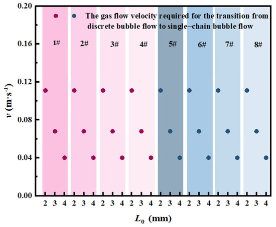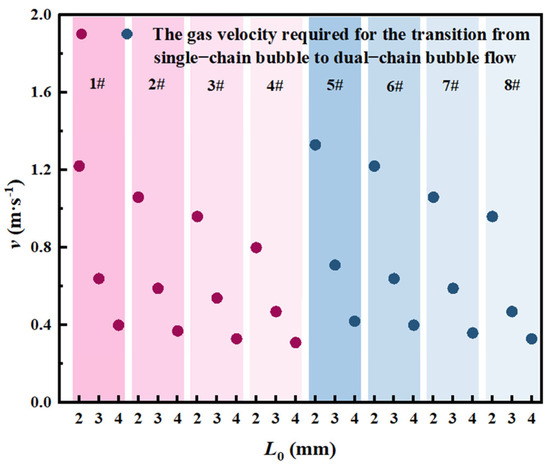 As shown in Figure 16, systems with larger orifice diameters exhibit higher volumetric flow velocities during bubble generation under identical gas flow velocity conditions. Following the detachment of the initial bubble, the augmented gas volumetric flow velocity significantly shortens the time interval required for subsequent bubble formation. This acceleration reduces the vertical spacing between the lower surface of the preceding bubble and the upper surface of the following bubble as the orifice diameter increases. The diminished inter-bubble distance enhances hydrodynamic interactions, where the flow characteristics of the preceding bubble exert a substantial influence on the formation dynamics of subsequent bubbles. Consequently, the critical gas flow velocity required for the transition from single- to dual-stage chain bubble flow regimes shows a marked reduction with increasing orifice diameter.