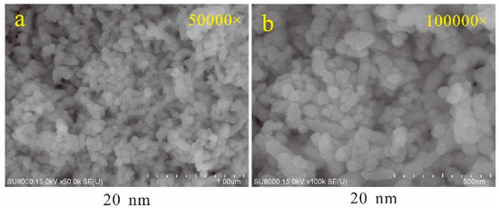 Hydrophilic CaCO3 particles with an average particle size of 20 nm were prepared by Specialty Minerals Inc. (New York, NY, USA). Figure 1 presents scanning electron microscopy (SEM) images of the hydrophilic nano-CaCO3 particles employed in this study. The comprehensive characterization of these particles, including wettability analysis, surface functional group identification, and dispersion behavior evaluation, was previously reported in our earlier work [12]. Other experimental materials included distilled water (prepared in the laboratory); clay sepiolite; filtrate reducers: low-viscosity anionic cellulose (LV-PAC), carboxymethyl starch (CMS), low-viscosity carboxymethyl cellulose (LV-CMC), sulfonated phenolic resin (SMP-2), and hydrolyzed ammonium polyacrylonitrile (NH4-HPAN); flow modifiers: guar gum, sesbania gum, xanthan gum (XC), high-viscosity carboxymethyl cellulose (HV-CMC), and high-viscosity polyanionic cellulose (HV-PAC); and high-purity N2 and CH4 gas with a purity of >99.9% (Wuhan Nuruide Special Gases Co., Ltd., Wuhan, China).