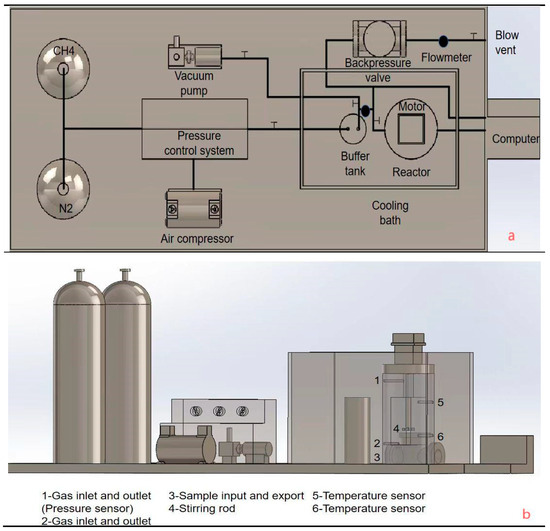 Schematic diagram of HCSHW-1 multifunctional hydrate reaction simulation device: (a) top view and (b) front view.