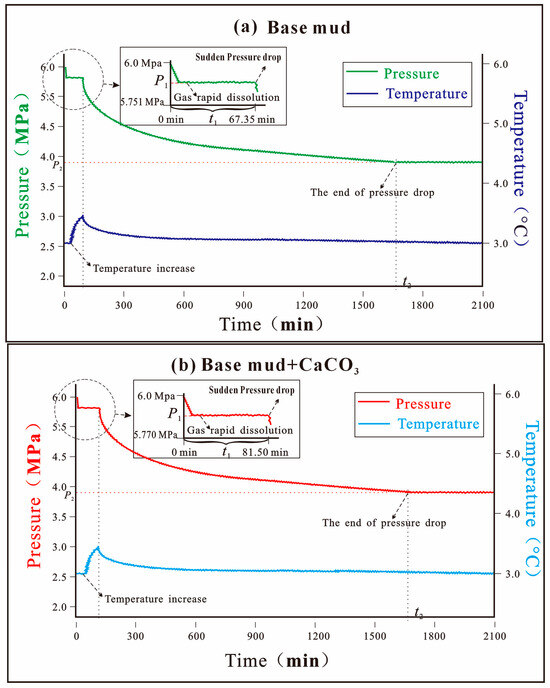 Temperature–pressure variation curves during hydrate reaction in (a) base mud and (b) nano-CaCO3 + base mud.