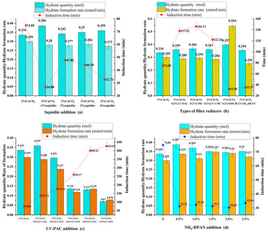 (a) Kinetic parameters of hydrate formation of different concentrations of sepiolite with 3% nano-CaCO3. (b) Kinetics parameters during hydrate formation in different filter reducers and nano-CaCO3 systems. (c) The influence of different LV-PAC concentrations on hydrate formation quantity and rate. (d) The influence of different NH4-HPAN concentrations on hydrate formation quantity and rate.
