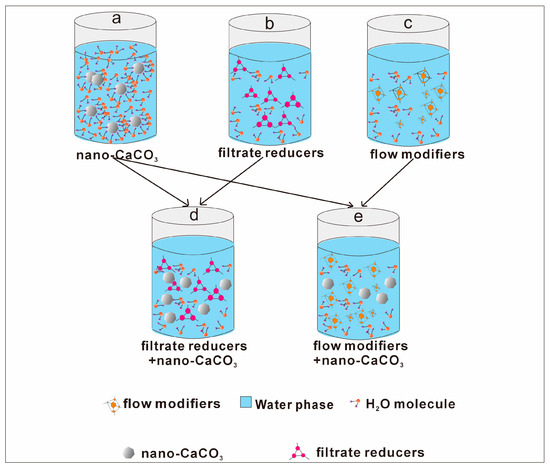 Microscopic mechanism explanation diagrams of filtration reducers and flow modifiers containing nano-CaCO3.