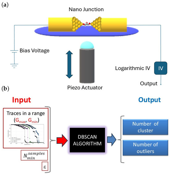 (a) Illustration and basic circuit of a MCBJ. (b) Input and output sketch of the DBSCAN algorithm.