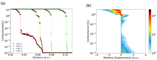 Figure 2a shows a selection of traces from the same experiment, plotted on a logarithmic scale relative to displacement. It is well known that when an atomic contact is clean, the conductance drops sharply to the tunneling regime after the final atomic plateau at upon further elongation [31,32,33]. In contrast, when a molecule is present between the electrodes, a plateau often appears in the sub-quantum conductance range due to its low transmission [16]. Traces 1 and 2 in Figure 2a exhibit conductance plateaus between and , despite the absence of any intentionally deposited molecules. This behavior suggests the presence of contamination, potentially due to unintentional molecular junctions or residual species influencing the conductance. In contrast, traces 3 and 4 drop abruptly from to below , without exhibiting any intermediate plateaus; these can therefore be classified as clean traces.