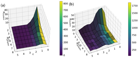 Three-dimensional plots showing the number of clusters (z-axis) as a function of the DBSCAN parameters and . The color scale indicates the number of outliers detected. (a) Corresponds to the first iteration and (b) to the second iteration of DBSCAN.
