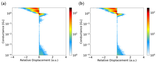 As can be observed, the contaminated traces shown in Figure 4a behave quite differently. Around , a bluish cloud is clearly visible, indicating contamination. In contrast, the density plot in panel (b) exhibits very few counts within a noticeable gap between the atomic contact of gold (∼) and the tunneling regime (which starts around and is characterized by its slope on the logarithmic scale). Although a small number of points remain in this clear gap, the number of counts in this gap is three orders of magnitude compared to the maximum. These isolated points are typically attributed to artifacts from the data acquisition system (DAQ).