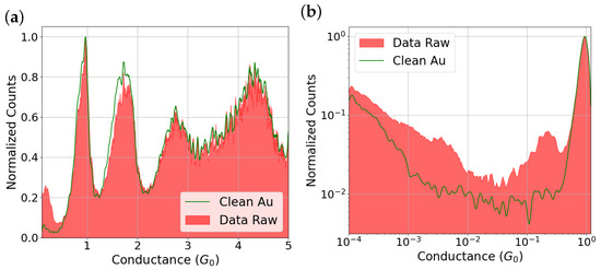 Moreover, we want to bring clarity to our message and to more conclusively demonstrate the cleanliness of the selected traces. Therefore, we propose an additional statistical analysis based on normalized conductance histograms (to one quantum of conductance), presented in both linear and logarithmic scales (see Figure 5). In these histograms, we compare the raw dataset with the subset of 3912 traces identified as clean. The color code indicates red for the raw data and green for the data classified as clean.