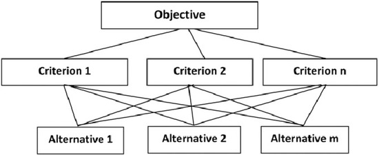 In comparison, MADM addresses problems that have a limited number of discrete, predetermined alternatives; examples include Complex Proportional Assessment (COPRAS) and its progenitor method, Simple Additive Weighting (SAW) [2,3]. Due to their versality and multi-dimensional applications, MCDM methods have been implemented across various disciplines, from (municipal solid) waste management to the production of raw materials [4,5,6]. MCDM/A can be utilised individually or as part of an integrated model, such as the Fuzzy Analytic Hierarchy Process (FAHP) or the FAHP-Technique for Order of Preference by Similarity to Ideal Solution (TOPSIS). Resultantly, different MCDM methods can provide varying ranking results based on their methodologies and the preference of the decision-makers [7]. Decision-makers can then classify and prioritise alternative solutions, based on criteria rankings, and choose which one is the overall “best” [8,9,10,11]. A simple example of an MCDM process is provided in Figure 1, which was used as the basis for the FAHP–TOPSIS framework of this study.